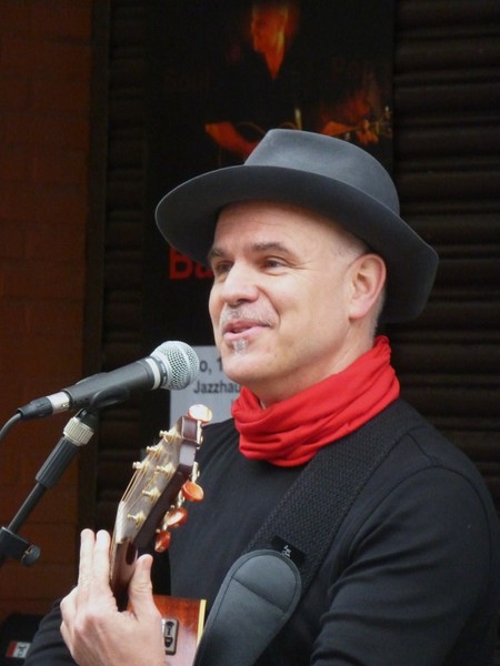 Lobo Ackermann spielte schon um 12 Uhr statt um 13 Uhr, aber dafür waren seine Gitarrenklänge ein Genuß. Auf dem Samstagsmarkt zu spielen ist angenehm, da Herr Ackermann im Oktober wiederkommen möchte.