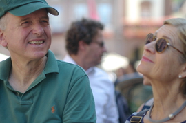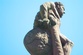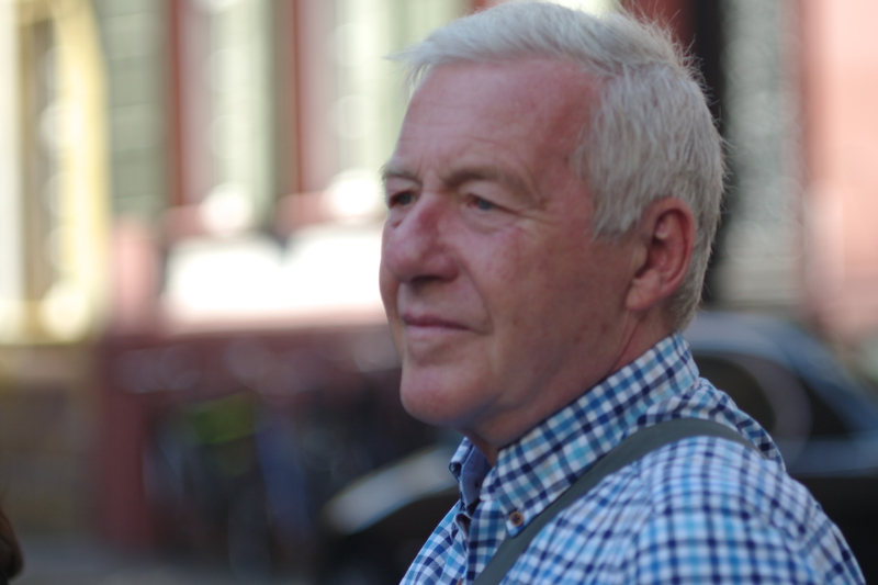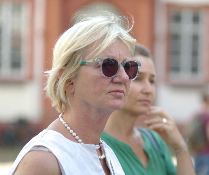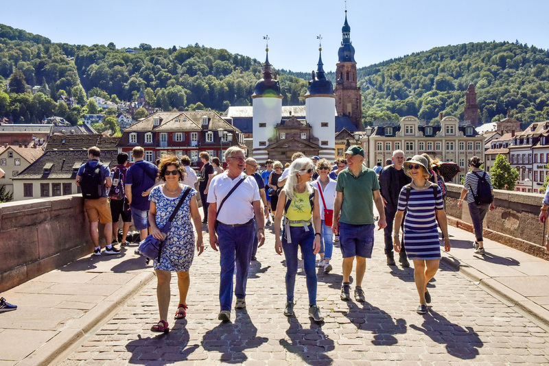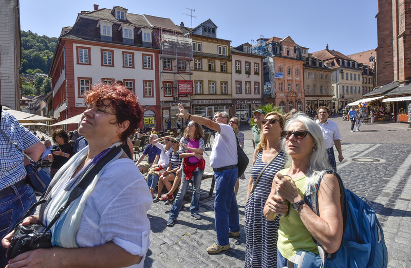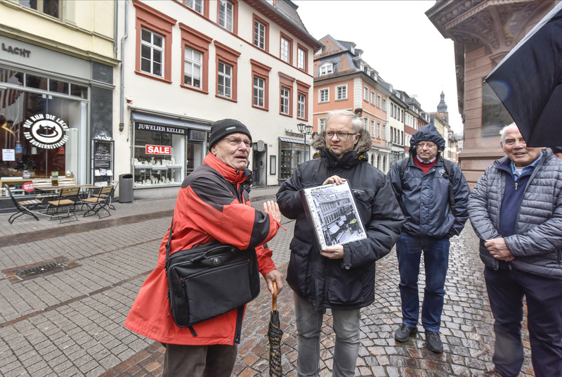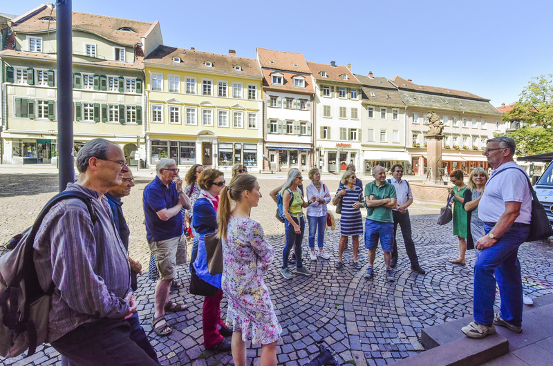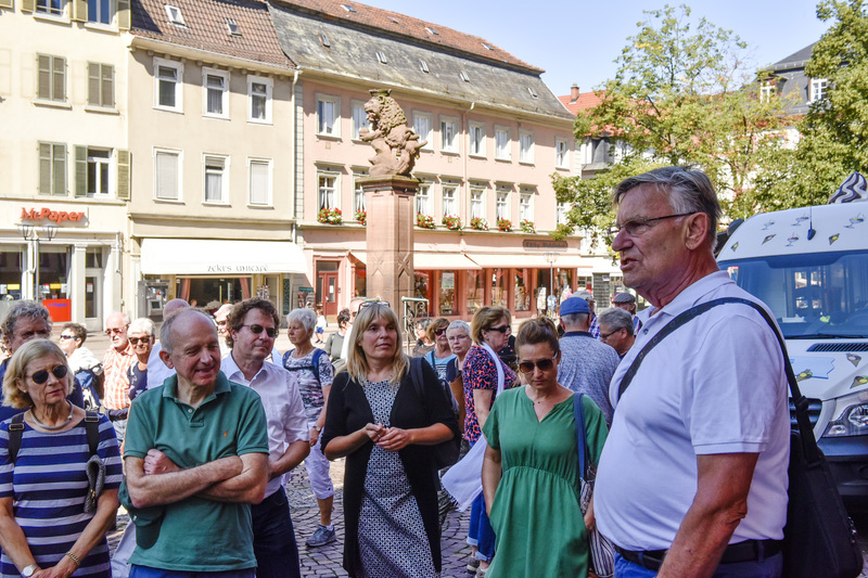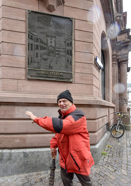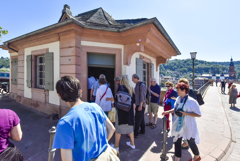 Danach geht es weiter in die Steingasse und dem südlichen Brückenkopf der Alten Brücke. Beim Überschreiten der Alten Brücke erläutert Herr Berberich die Neckarquerung durch das Kloster Schönau im 13. Jhd., die sieben meist durch Hochwasser mit Eisgang zerstörten Brücken, die beiden Standfiguren Kf. Carl Theodor und Minerva sowie den nördlichen Brückenkopf mit dem Pilgeraufstieg über den Schlangenweg zum Heiligenberg, die Pilgerkapelle und die Nepomuk-Standfigur.