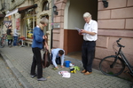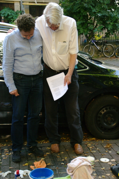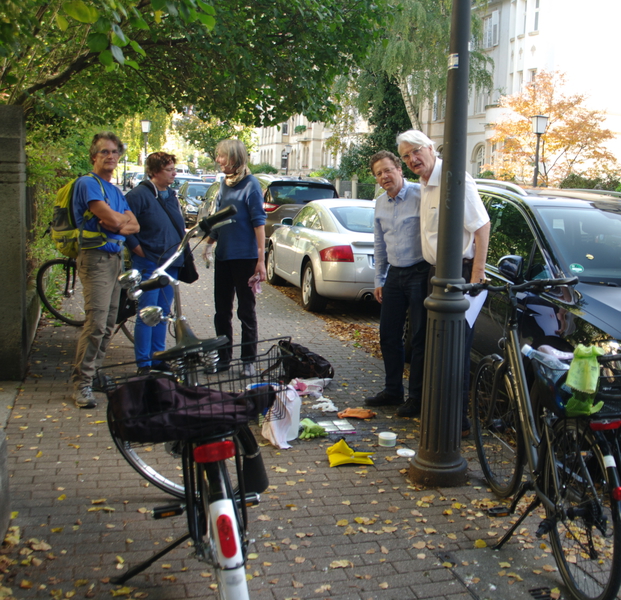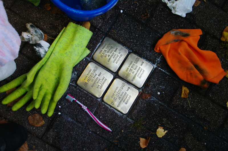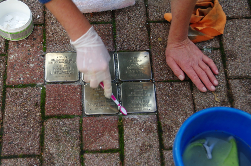 um 11 Uhr mit Fahrrad, Putzeimer od. Spülisprühflasche und Lappen. Spezielles Mittel für Metalloberflächen bringen wir mit. Wir teilen uns dann nach Straßen auf und Kurzbiografien zu den